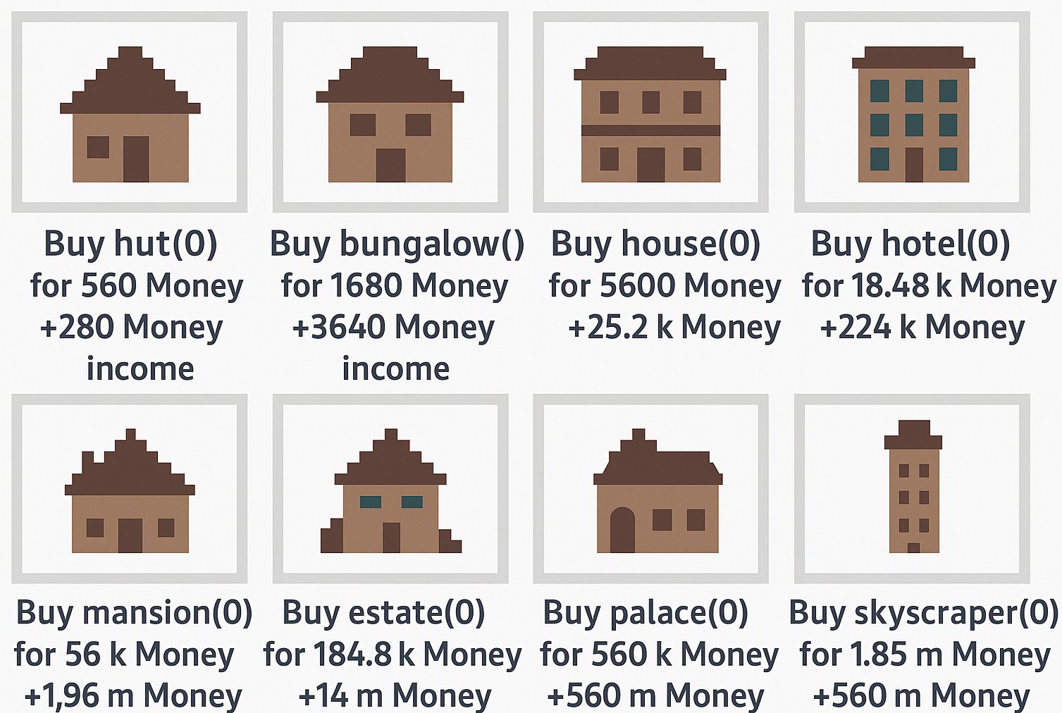 Der Gebäudebau wurde deutlich erweitert. Statt nur Häusern und Hotels gibt es jetzt viele neue Baustufen – von einfachen Hütten bis hin zu großen Spezialgebäuden mit besonderen Effekten.