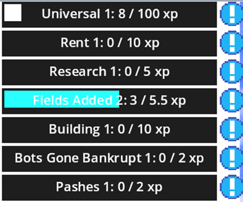 Über einen großen Forschungsbaum schaltest du nach und nach neue Inhalte frei – etwa Handel mit Bots, eine Bank für Aktien und Kredite, Einblick ins Vermögen der Bots, zusätzliche Kartenstapel und neue Feldtypen.